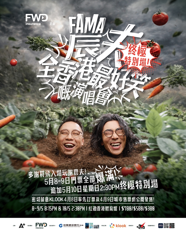 今年5月,农夫将时隔16年再次于红馆举行演唱会,首场和加场之前都分别在一小时内全部售罄,这个消息令到陆永及C君都觉得有点受宠若惊,日前他们更开心宣布将于5月10日母亲节下午加开终极特别场!4月8日Klook率先订票,4月9日Urbtix公开发售,还想买票的歌迷一定要留意了。