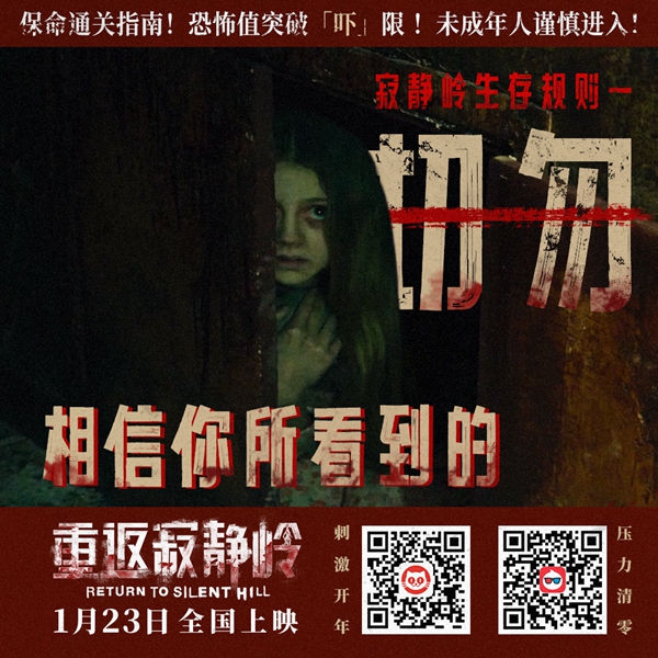 改编自全球经典惊悚游戏IP的电影《重返寂静岭》将于1月23日同步北美上映,首登内地大银幕刺激开年。影片今日释出的特别视频揭露了寂静岭中的生存规则,各种虚实难辨的提示语勾勒出诡谲的世界观设定,并助力内地影迷、玩家大银幕“通关”寂静岭。