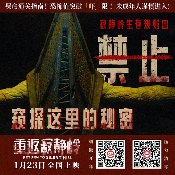 影片此次曝光的“一命通关”版特别视频则为内地观众们提供了“通关”生存规则——“切勿相信你所看到的”,当警报声响起,里世界已然降临,每一处景象都可能是潜藏的陷阱;“切勿相信你所听到的”,声音会指引你,更会欺骗你,唯有相信本能捕捉逃亡信号;“不要直视 TA 们的眼睛”,与这里的任何存在对视,都将坠入恐惧深渊;“禁止窥探这里的秘密”,追寻秘密的人,终将成为秘密的一部分。最重要的是,“不要试图寻找寂静岭的出口”,似乎也在暗示着,只有真正找到重返寂静岭的理由,才有一线生机。