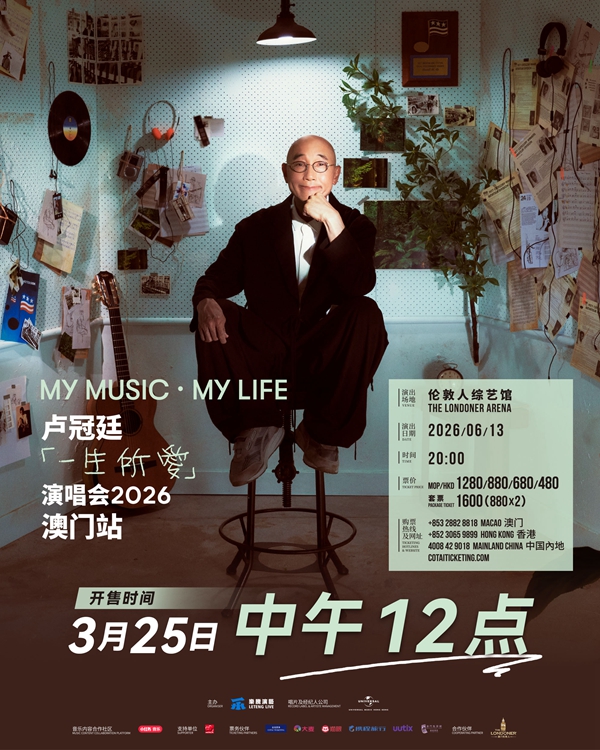 香港乐坛传奇音乐人卢冠廷上年6月在香港红馆举行一连两场「My Music·My Life 一生所爱」演唱会,反应叫好叫座。今年1月,他更开启了巡演并在广州举行了首站演出,当地观众的热情给卢冠廷留下了深刻的印象,他在演出后也表示广州那晚的感动会一直记在心里。6月13日,他将第一次去到澳门开show,期待到时在伦敦人综艺馆迎来新的感动,演出将于3月25日中午12点正式开售。