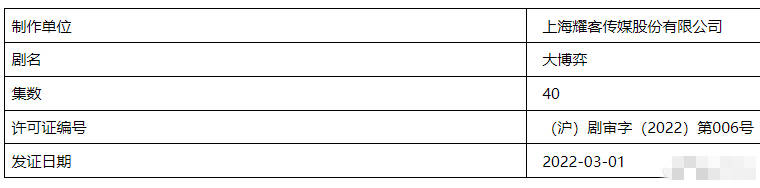 3月1日,由韩晓军执导,秦昊、万茜、田雨、张萌、谭凯主演的都市情感剧《大博弈》获得发行许可,根据备案表显示,该剧2021年5月开始拍摄,共有40集,制作单位为上海耀客传媒,制作周期12个月。